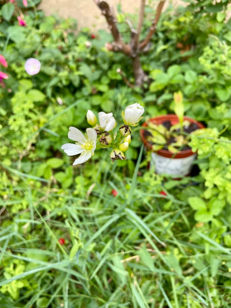 Malheureusement, les fortes pluies début juillet ont perturbé la floraison et seulement 3 fleurs sont sorties. Les autres bourgeons sont morts avant d’éclore. J’ai laissé ma Dionée tranquille et lui ai juste donné de l’eau en croisant les doigts pour que les fleurs donnent des graines.