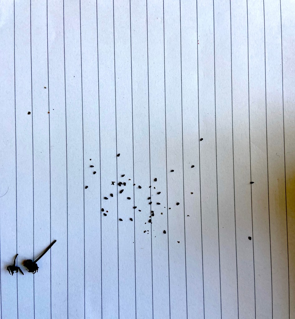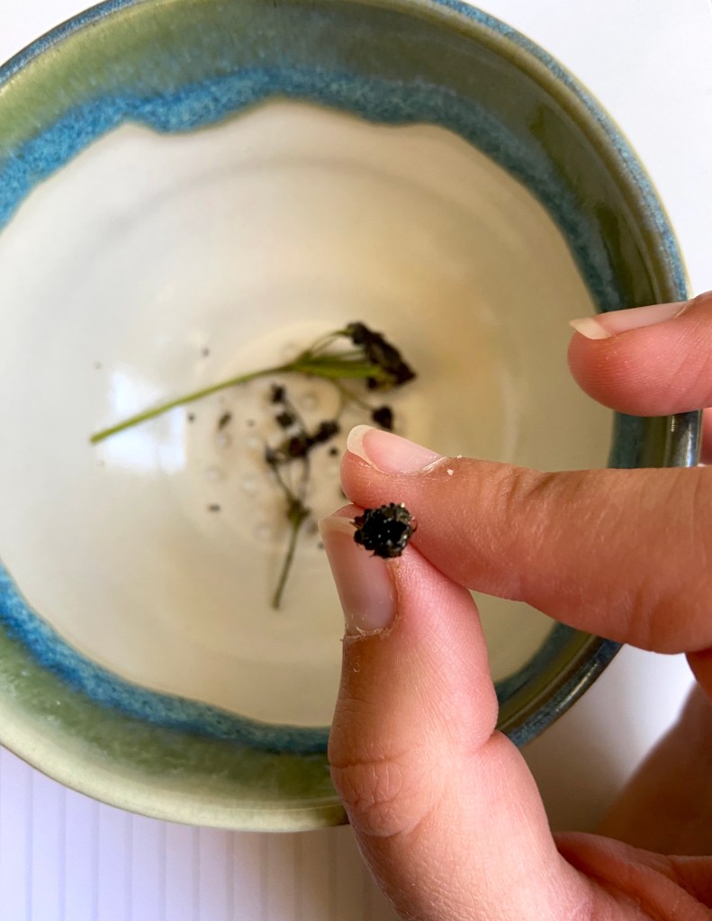 Finalement, à la mi-août, les fleurs étant toutes sèches, je me suis dit qu’il était temps de couper les tiges et de regarder si je pouvais récupérer des graines. J’ai regardé quelques tutos sur YouTube et je me suis lancée. Je m’attendais pas à ce que les graines soient si petites ! C’était vraiment une opération délicate de les détacher de la fleur sans les faire tomber par terre et les perdre. Pourtant, j’ai bien vérifié, les graines que j’ai récupéré des fleurs de ma Dionée ressemblaient fortement aux images de graines que j’ai pu observer sur Internet. On verra bien si elles poussent au moment de la semaison au printemps prochain !