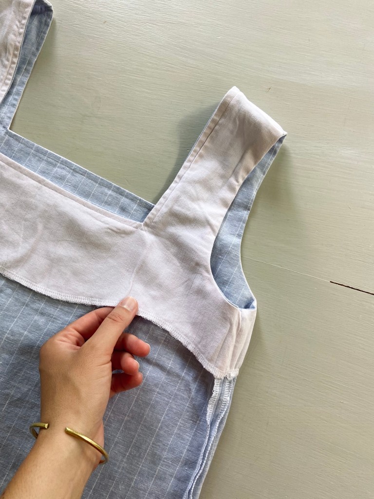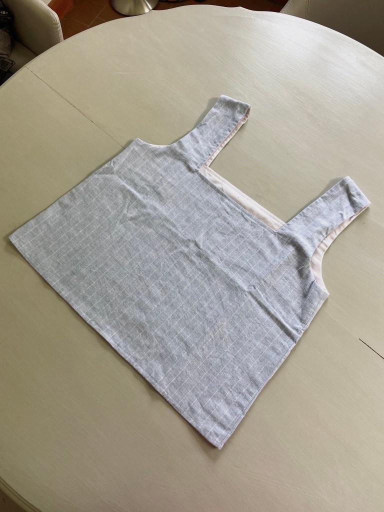 Modifications : j’ai rallongé le haut de quelques centimètres et doublé la pièce devant pour éviter une parementure et atténuer la transparence.