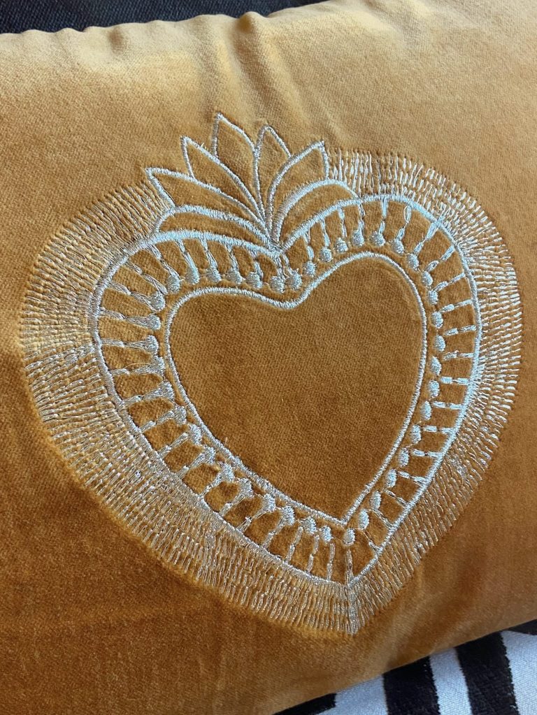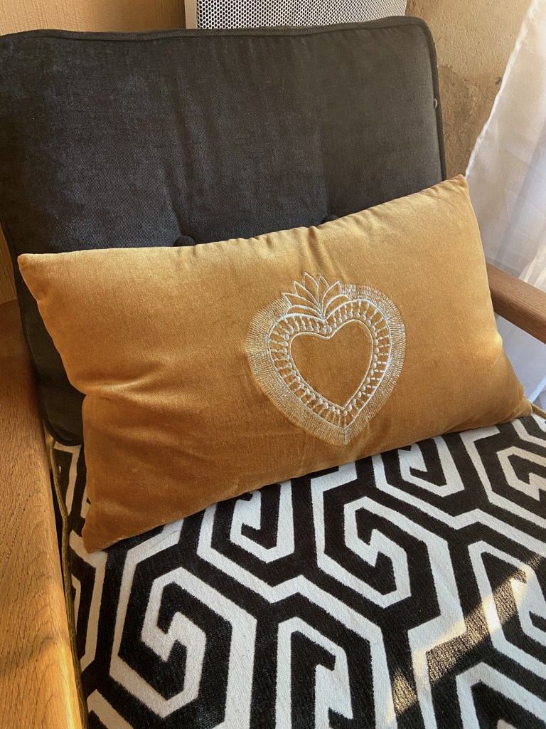 Je suis tombée sur ce superbe coussin en velours ocre brodé d’un coeur sacré doré, esprit cabinet de curiosité, je l’ai pris direct ! Je me suis dit qu’il irait parfaitement sur mon fauteuil, qu’en pensez vous ?