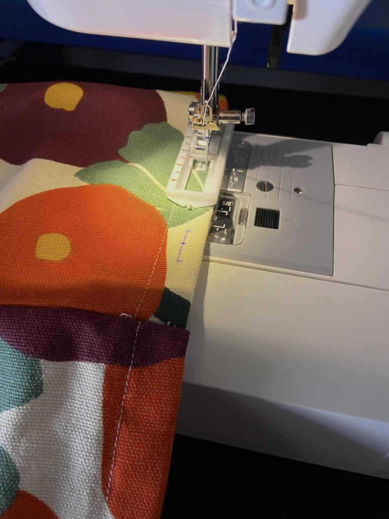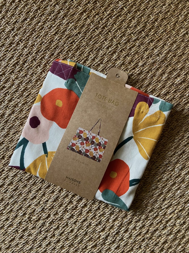 Mais, en arrivant à la caisse, sur les étendoirs juste avant, mon oeil a été attiré par ce magnifique Tote bag ! J’ai adoré le motif et les couleurs, j’ai pensé qu’il s’associerait parfaitement avec mon coussin en velours. J’ai cogité et ai eu l’idée d’utiliser mes « talents » de couturière (débutante hein) pour le transformer en coussin.