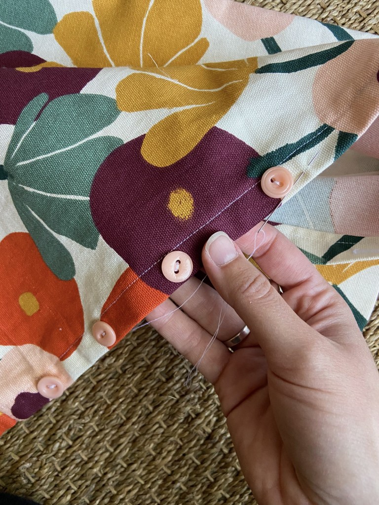 Je voulais pouvoir enlever et laver la housse, c’est pourquoi j’ai prévu une ouverture. Je n’avais pas de Zip assez long dans mon stock, j’ai donc opté pour des boutons.